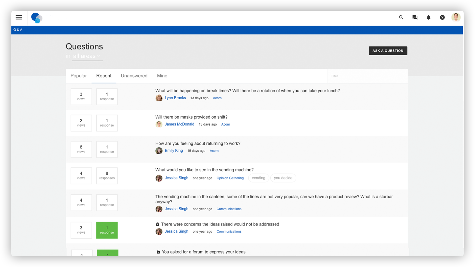 A Q&A forum is a quick and efficient way to answer internal company questions. It's also a great way to have a living resource always available for your people. No matter what time of the day, answers are just one click away.