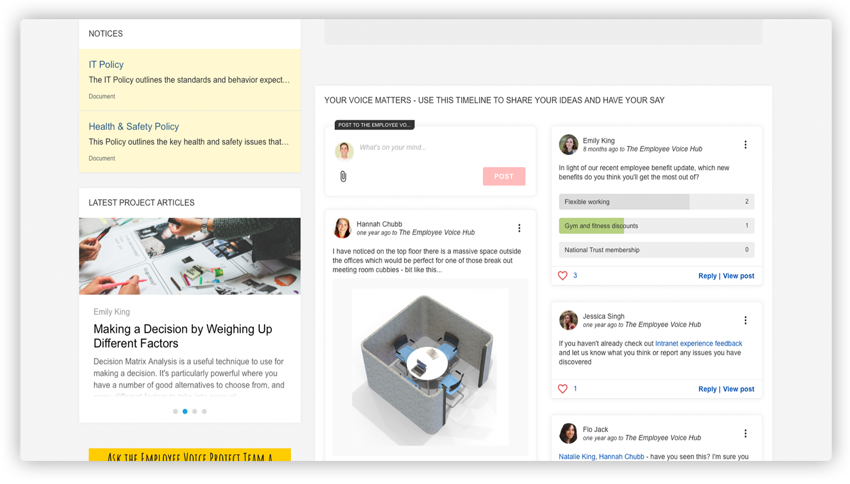 A poll is designed as a collaborative tool to increase employee engagement, productivity and efficiency. Companies no longer have to gather information by email, but can start a poll on their intranet, it may be used to get an understanding of what your people want, involve more employees in conversations or leverage a poll to generate content. By targeting specific employees, polls can generate data or content that could be reused.