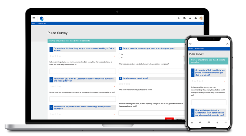 Pulse Surveys are used to gather real, actionable insights that businesses can use to improve employee engagement, collaboration and enhance employee experience. They also allow your business to gauge interest, understand an employees opinion, gather feedback and more. Oak surveys are a versatile tool that gives you everything you need to get valuable data from employees, all within your company intranet.