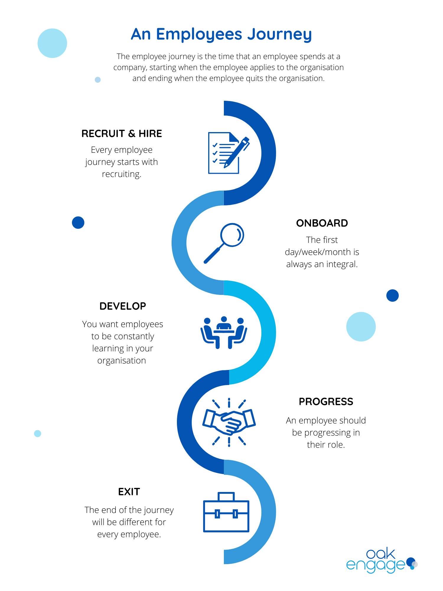 An employee journey map is a visualisation of the timeline of the entire employee experience.