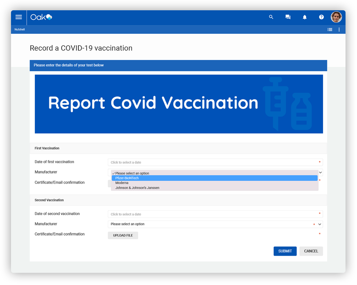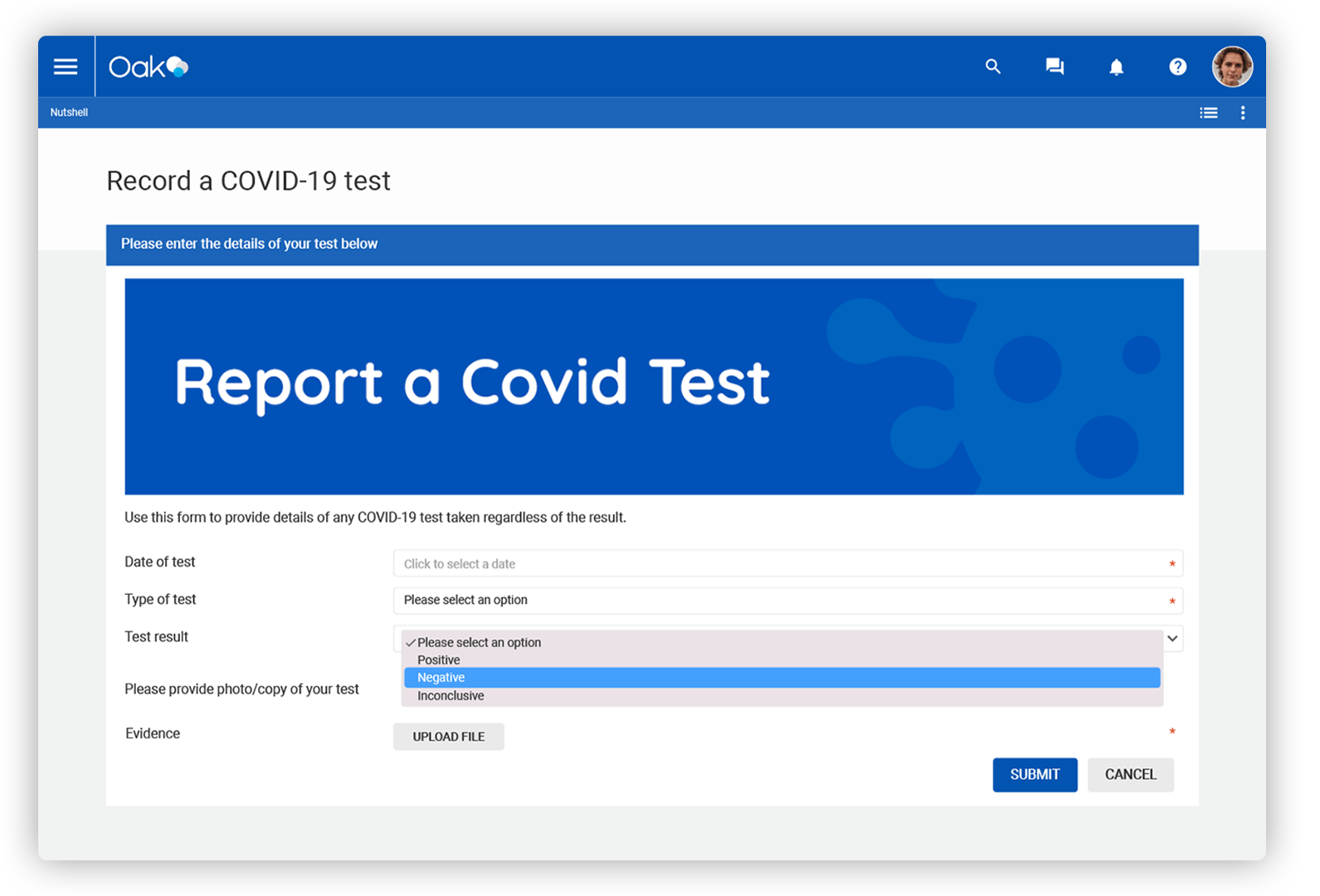 Whether you’re wanting to track the status of vaccinations in your workforce, or record of a test result. Oak helps you do this efficiently, all on your company intranet.
