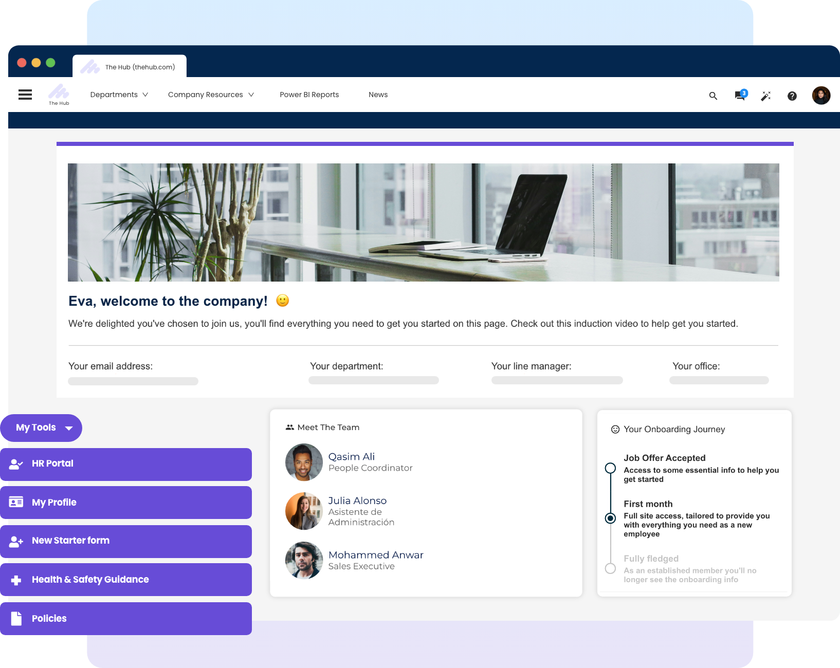 A central, organised hub smooths out internal communication flow and collaboration. For new starters, it makes onboarding processes so easy: they get instant access to everything they need, helping them feel like part of the team and giving them the ability to thrive in their role from day one.
