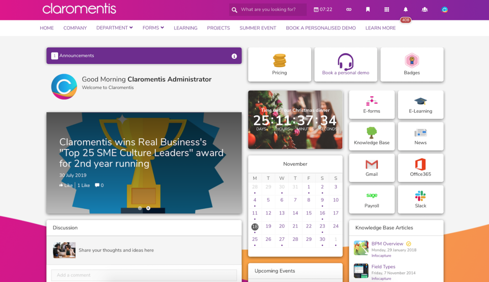 Claromentis gives organisations a digital workplace for their employees. They expand the capabilities of a traditional intranet software by empowering people to access information and communicate with their co-workers.