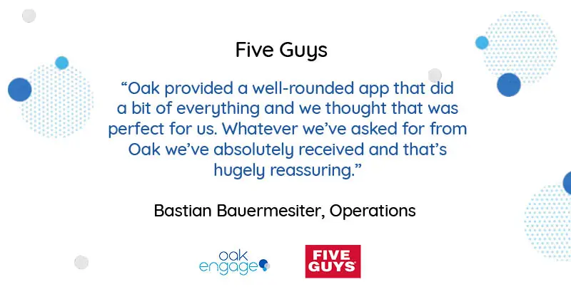 Five Guys: How do you connect a workforce that spans four countries? With an Oak Intranet solution. Oak helped Five Guys shift from traditional printed methods of communication.